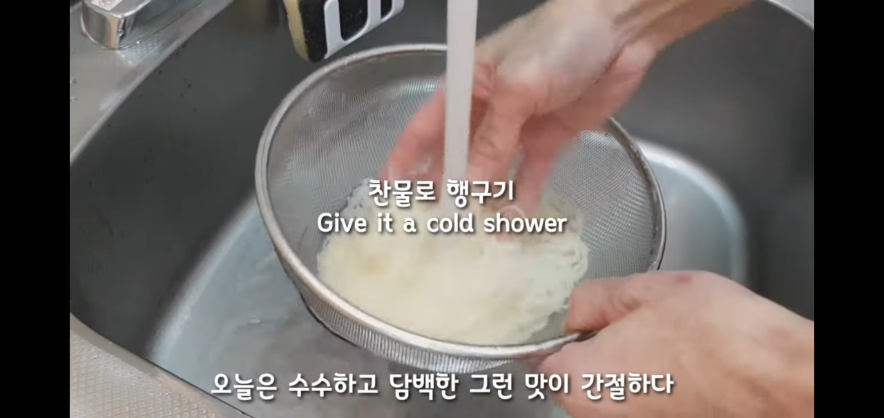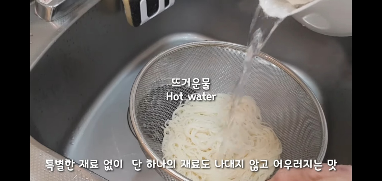 채에 받친 면은 처음에 찬물로 헹구어서 쫄깃하게 해주고, 다음은 뜨거운 물을 부어서 면이 굳지 않게 해주자.