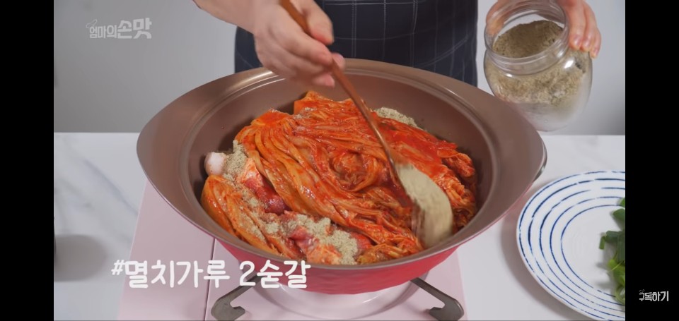 10분간 익힌 김치찜에 후추를 약간 넣어준 뒤에 한 번 살짝 섞어주자.